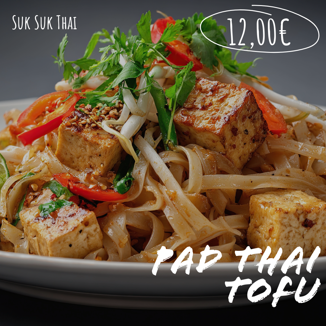Le Pad Thai (ผัดไทย) est un plat de nouilles sautées avec du bœuf, du poulet, du tofu ou des crevettes, des œufs, des pousses de soja et des cacahuètes, assaisonné de tamarin et servi avec du citron vert.