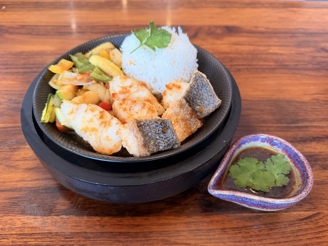 Mélange de bar, dorade et églefin, légèrement frits puis nappés d’une sauce Priaw Wan maison. Équilibre parfait entre acidulé et douceur fruitée.